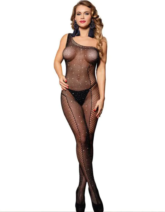 Senzualita a elegance se spojují v tomto černém bodystockingu z jemné síťoviny zdobeném diamanty. Jeho asymetrický design a jedno rameno zvýrazňuje postavu a dodává luxusní nádech pro zvláštní okamžiky.