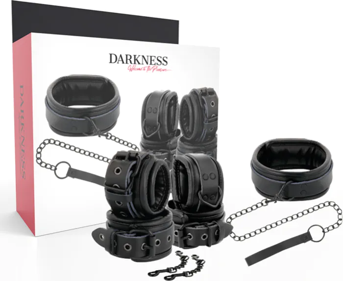 Pohodlné a bezpečné BDSM hrátky s koženým obojkem a pouty DARKNESS. Vyrobeno z kvalitní kůže, tyto doplňky zajišťují intenzivní a bezpečné zážitky. Nastavitelné popruhy s tlakových uzávěrem vyhovují téměř každé velikosti, což z nich dělá perfektní volbu pro každého, kdo chce zkusit BDSM.