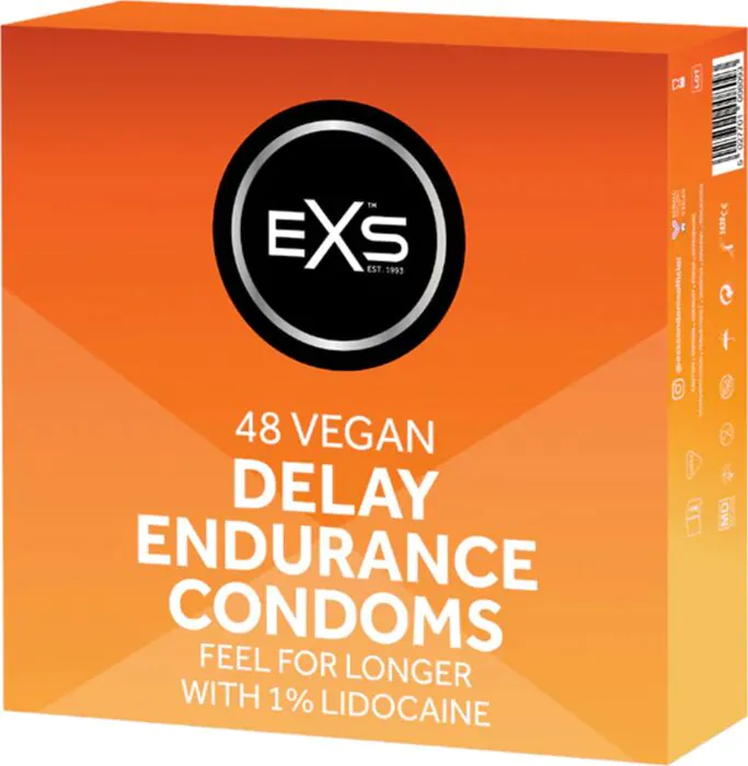 Pomáhají oddálit ejakulaci díky obsahu lidokainu, což snižuje citlivost. Kondomy Exs Delay 48s jsou transparentní, lubrikované silikonem a mají příjemnou šířku 53 mm pro většinu mužů.