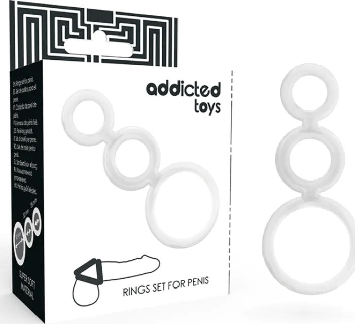 Intenzivní podpora a dlouhotrvající potěšení s kroužky ADDICTED TOYS. Tyto kroužky jsou navrženy tak, aby zamezily předčasné ejakulaci a nabízely pohodlné nošení bez sklouznutí. Sada obsahuje tři různé velikosti pro ideální přizpůsobení.