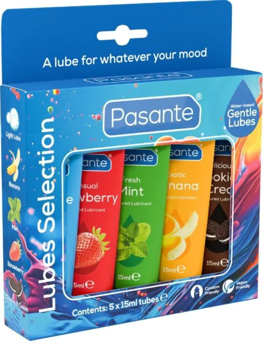 Praktický balíček lubrikantů PASANTE přináší pestrost a jednoduchost ve vašem intimním životě. S pěti tubičkami o objemu 15 ml si můžete vychutnat různé příchutě, které obohatí chvíle vášně. Díky vodní bázi je bez lepivosti, snadno se nanáší a vypláchne vodou.