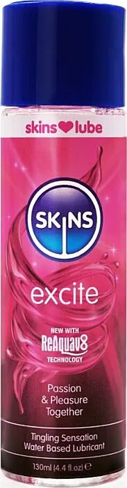 SKINS Excite nabízí jemné brnění a zlepšuje klouzání při intimních chvílích. Tento lubrikant na vodní bázi obsahuje L-arginin a extrakty z červeného jetele a ginkgo biloba pro intenzifikaci pocitů. Při zaschnutí stačí přidat pár kapek vody a efekt bude okamžitě obnoven díky technologii ReAquav8.