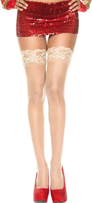 These are plain, beige thigh-high stockings from Music Legs that include Lycra for stretch. In the shop I’d tell you they’re the kind of stocking you pull on when you want a smooth, natural look with a little give — comfortable for walking and sitting without feeling tight. Because they’re simple and unadorned they work as an everyday option or as a neutral base under smarter outfits.