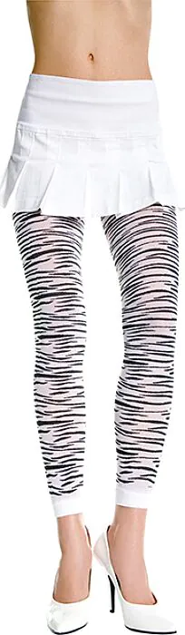 These are fashion tights by Music Legs featuring a zebra stripe design in black and white. Think of them as a styling piece: they bring a graphic, animal-print accent to skirts, dresses or layered looks. I’d show these to someone after a bold, patterned pair rather than plain hosiery — they’re about adding visual interest rather than support or shaping.