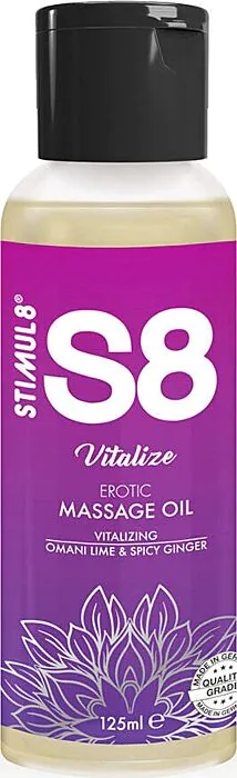 STIMUL8 S8 Vitalize je olej na masáže s citrusovým aroma a jemnými vlastnostmi. Hladká pleť po každém použití, ideální pro příjemné masáže.