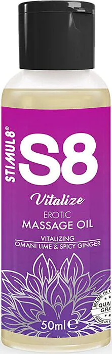S8 Vitalize je smyslný olej na masáže, který nabízí skvělou hydrataci a hedvábný pocit na pokožce. S vůní limetky a zázvoru dodá vašim masážím nový rozměr.