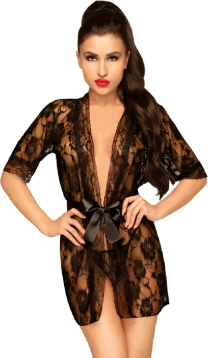 Pohodlný peignoir s tanga, který oslavuje ženskost. Vyrobený z lehkého nylonu, ideální pro ty, kteří hledají sexy a udržitelnou lencerii.
