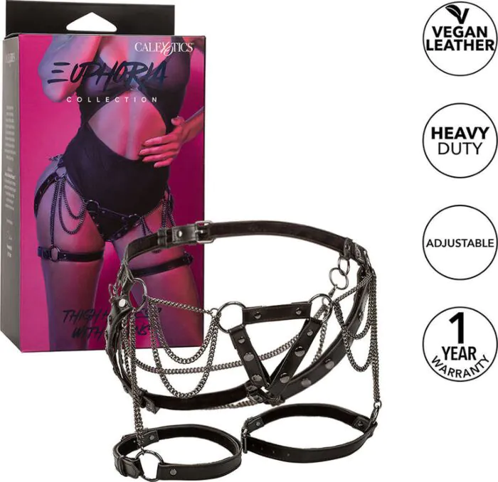 Oslňte svou vášeň díky postroji Euphoria, který spojuje komfort a odvážný styl. Vyrobený z měkkého sametu, postroj se skvěle nosí na pokožce a silné řetězy dodávají příjemný pocit hmotnosti. S nastavitelnými popruhy v pase a na stehnech se přizpůsobí většině standartních velikostí, což umožňuje bezpečné a pohodlné nošení.