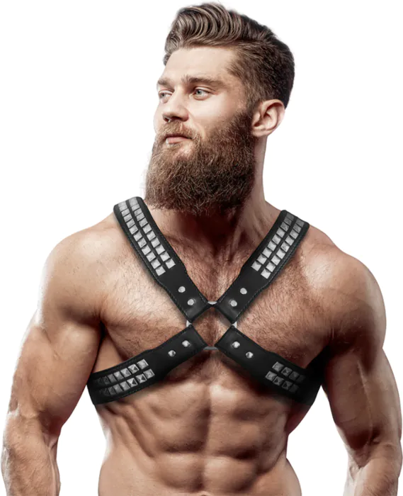 Postroj z veganské kůže, který zvýrazňuje mužskou postavu a poskytuje komfort. Ideální pro ty, kteří hledají spojení stylu a pohodlí.