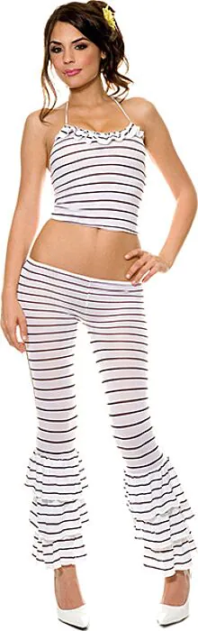 Odvážný a šik styl s jedinečným pruhovaným designem, který osvěží váš šatník. Kalhoty pirátky a top od Music Legs přinášejí svobodu pohybu a netradiční vzhled. Vhodný jak pro večerní akce, tak pro každodenní nošení.